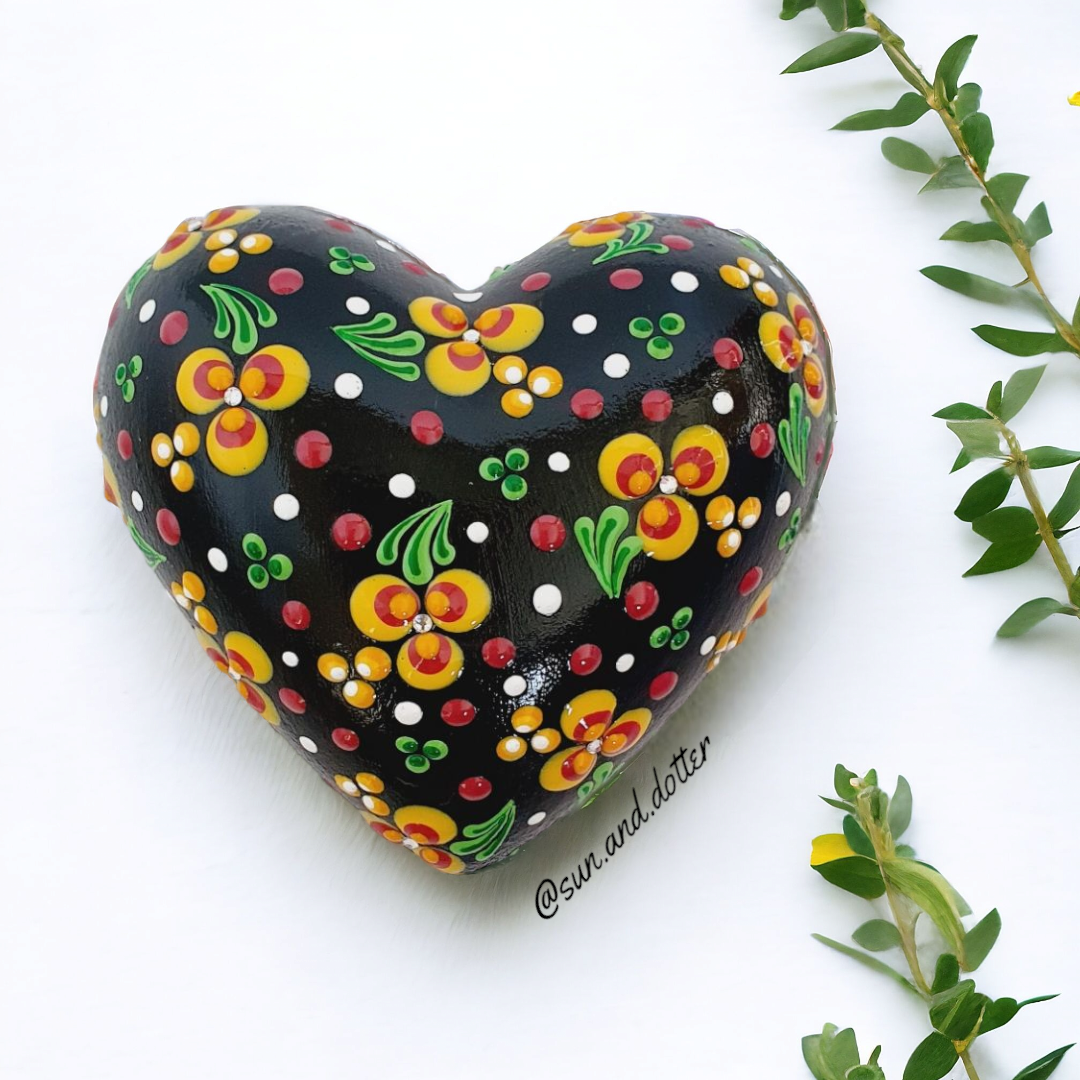 Painted against a bold black background, this heart stone serves as the perfect canvas for a whimsical floral design in shades of yellow, orange, white, and fuchsia. Each little flower is adorned with adorable leaves and a central diamond, adding a touch of glam and sophistication to the design.